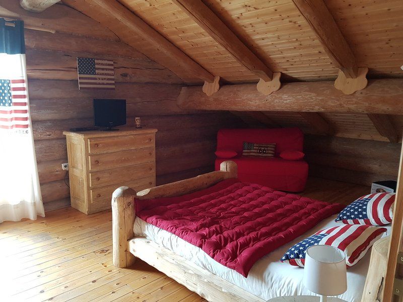 - 1 grande mezzanine équipée d’un lit de 140, bibliothèque, coin détente
